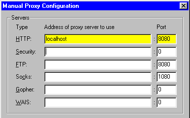 Here's a sample from Netscape's manual proxy setup screen. To use the Proxomitron, set your browser's proxy options to match those areas below highlighted in yellow.