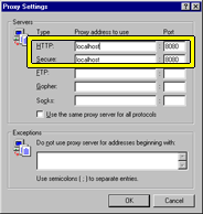 For Internet Explorer 3.x & 4.x: Select "View," "Internet Options," then click the "connections" tab. Click "Use proxy server" and click "advanced" or "settings" (for 4.0 and 3.0 respectively). Under HTTP enter "localhost" and for port "8080". Leave the other proxy entries (FTP, Gopher, etc.) alone. You can also set the proxy from the Control panel's Internet options.