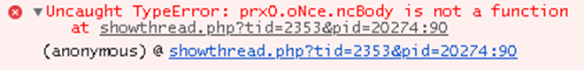 (Jan. 29, 2022 05:37 AM)JJoe Wrote: Does the error go away? The error does go away And everthing does seem to work better - will continue to monitor. This web page (the one we are viewing right now) shows the attached error - but I have not yet seen this error in other web pages. The text "oNce.ncBody" only exists in "Body Add: JS Code 19.02.23 (ccw!) [...] (d.r l.3)". I found no "oNce.ncBody" in "proxjs-full.js" or "proxjs-x-menu.js" (assumed those to be the only two places to look). |