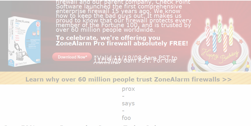 "Prox says foo" ----what the heck is THAT??? I get that message, even when BYPASSING Proxo or unchecking webfilters. I get it on Fx, IE and Opera when trying to get the free Zone Alarm offer.