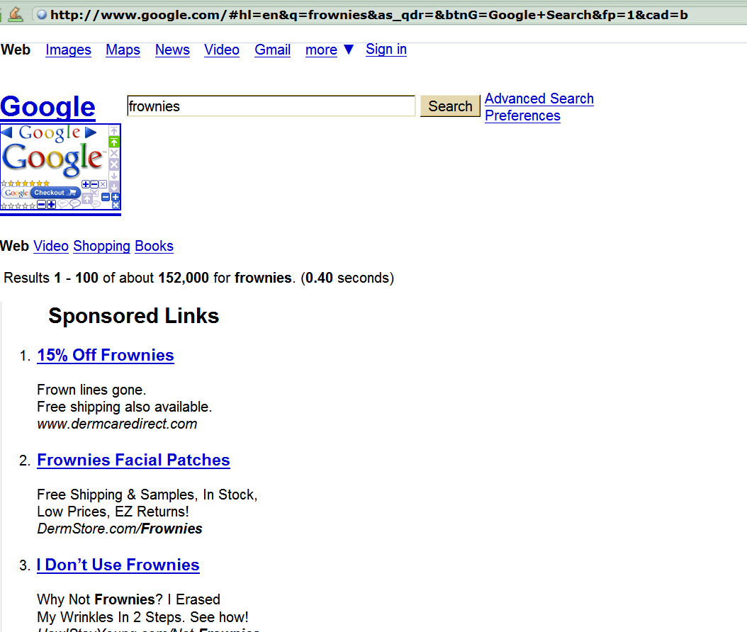 I had a tab open to the Google search for "frownies" and I happened to click on it just now and the display has changed. (This is NOT on the Fx browser where I installed NoScript. This is another computer with Fx 1.5). Look at the screen capture. What is that strange box about Google checkout in the upper left corner? I see that frequently now on Google searches but never until the past few days. If I click anywhere in that box it takes me, not to Google checkout, but to the Google home page.