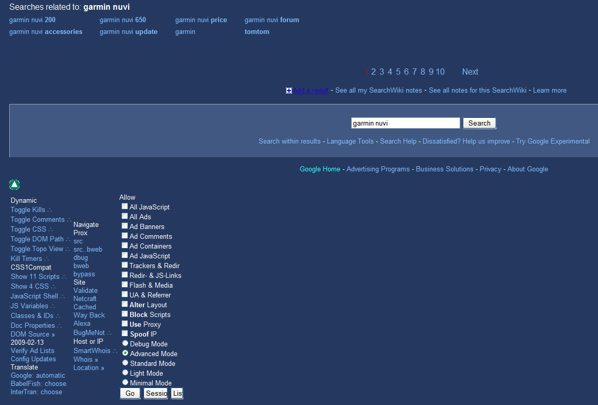 When signed out: Both worked well. (Apr. 26, 2009 06:20 PM)sidki3003 Wrote: To have the footer form, as well as the "1 2 3 ... Next" links shown again...Wored as expected no matter signed in or out. (Apr. 26, 2009 06:20 PM)sidki3003 Wrote: The ads can't be removed without major effort (see below), but they can be hidden.Hidden successful. When signed in, Toggle CSS made the ads appear again, which is expected. However, when signed out, I didn't see any ads no matter if Toggle CSS. (Apr. 26, 2009 06:20 PM)sidki3003 Wrote: To have the Google themes work again, see updated "Google Search: Alternate Display" and ". + Google Dark Blue Theme" in attached file. (Apr. 28, 2009 03:33 AM)JJoe Wrote: Searching with K-Meleon and the # version of Google gets an acceptable page with no numbers, date range box, thumbnails, or modifier links.No date range box, thumbnails on signed in or out. Numbers appeared on signed out but disappeared on signed in. When signed out, google logo, arrows and other image were not shown but would show in one place when toggle css. When signed out, page looked like zoomed in. google_signed_in.png (Size: 28.63 KB / Downloads: 735)