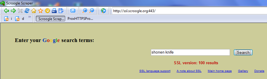 The referer header that I think may indicate a need for a filter is shown in Proxo's log Code: GET /scget.html HTTP/1.1Proxo can hide us from /scget.html but what about http://ssl.scroogle.org:443/sslnote.html? Couldn't a simple script detect us? document.location.href? Enough for tonight. |