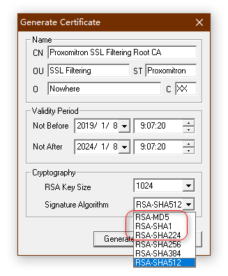 Another suggestion is to remove MD5, SHA1 and SHA224 from the Signature Algorithm drop down menu. They are either not secure any more or not approved for use with publicly trusted certificates. I can also foresee by removing them will also avoid new users complaining their browsers not working with the certificates and blaming it to Proxomitron.