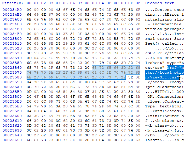 It seems the https backend of the Reborn version handles http requests also, so a temporary workaround is to change the hardcoded href="http://Local.ptron/ViewSrc.css" to href="//Local.ptron:8443/ViewSrc.css" (assuming you have set up 8443 for https) so that the stylesheet will loaded anyway on http or https sites.