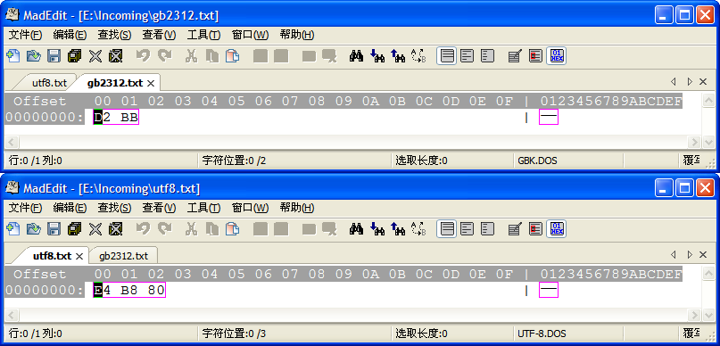 The same Chinese character takes 2 bytes under GB2312 encoding, or 3 bytes under UTF-8 encoding.