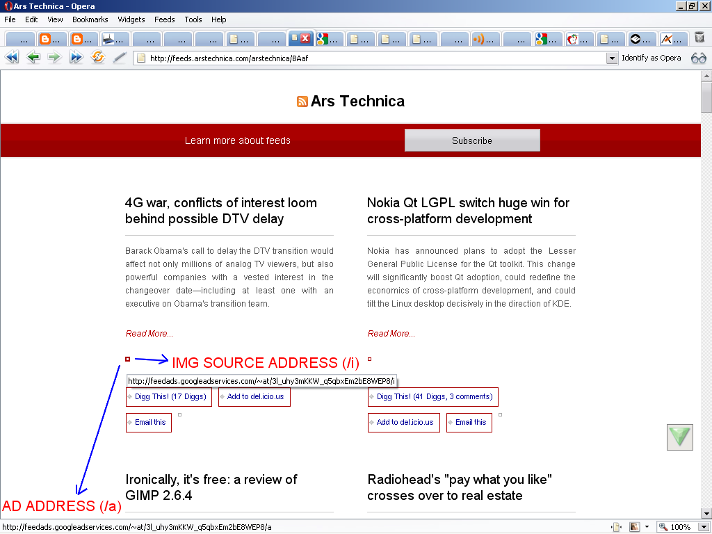 Quote:I loaded both feeds with Firefox. I didn't see any ads Beware of the preview mode, as every feed I tried in firefox and opera DIDN'T display any ads (although they WERE there). You could try also in IE, and FeedBurner will kick in and display a preview of their own (something to do with making the subscription more user friendly I guess?). This code apparently is embedded in the source feed. Please take a look at the attached pics. Different interpretations of the standard? Why would the unfiltered ads display in "subscribed mode" but not in "preview mode"? ARS FEED OPERA PREVIEW.png (Size: 59.82 KB / Downloads: 855)