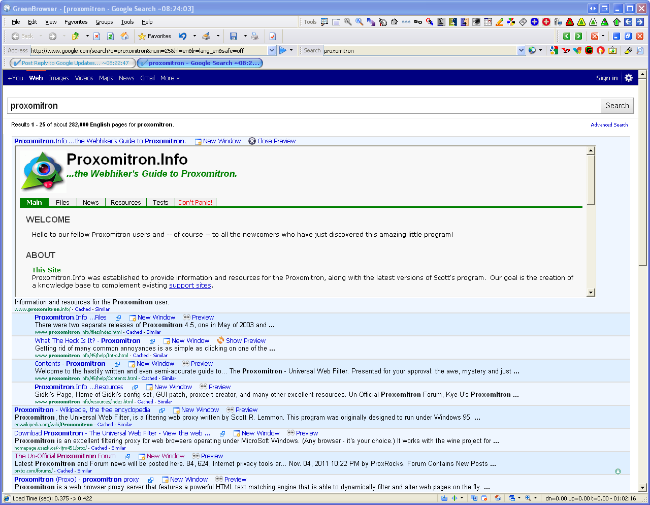 i use a "preview" feature (opens search results in an iframe within the same page instead of opening a new browser tab or window) that was first introduced by JD5000 and was never officially incorporated by sidki... first off, these no longer require the ". + Google Toggle: Left NavBar" filter and it should be un-checked (disabled)... these filters axe the NavBar and having "two" filters targeting the NavBar probably just introduces "risk" of them not 'playing well with others'... the other sidki, jjoe, et alia Google filters maintained by the Proxo Community should be kept in place ("Google: Convert Results: xslt.us & newverhost.com", "Google: Cached Header Mover", "Google: Multi URL Untangler", "Google Search: Remove Ad Blocks", "Google Search: Fix Shortcuts", "Google Books/Groups: Remove Ad Blocks", "Google Images: Direct Links")... be sure to un-check (disable) the other "theme" filters, of course... also un-check (disable) the infor bar, left bar, and logo theme-filters that are floating about (if you have them, you know the one's i'm referring to - these are not abandoned, per se, they are incorporated directly into my "theme")... these are not 'tested' with the "Google Search: Add Modifier Links" filter that 'comes with' sidki's config and is enabled by default as i disable that one for my own preference - i do not know if it "interferes" with my theme or not, to be honest... i'll let anybody that decides to use my theme report findings on that front... okay, "intro" / "disclaimers" aside, lol... here is the first filter that you will need to add... i have it placed directly beneath "Header Top Add: User JS Code on sel. Sites" in the "||| Pre-Body" section... you only need this if you want the "preview" function that JD5000 used to use... Code: Name = "Header Top Add: User JS Code - Google Preview [add]"these next three are placed immediately following the un-checked (disabled) publicly-maintained "Google Search: Alternate Display" (any publicly-maintained updates are incorporated into my theme)... Code: Name = "Google Search: Alternate Display - Part 1 11.11.12 {PFR} [add]"optionally, i also use this (placed directly above "Google Search: Add Modifier Links")... Code: Name = "Google Black Bar to Navy 11.07.03"that "should" be everything, i don't think i overlooked anything... it's a little more complex than just copying over a puplicly-maintained filter and "replacing" a sidki-provided filter - but well worth it, IMO, lol... these will be maintained and updated by me and re-released as changes come about... (i admit that "publicly" maintaining THREE themes that comes with sidki's config [dark blue, dark gray, light blue] is a wee-bit over-my-head...) but since i use "these" filters DAILY, i have a "vested interest" in keeping "these" up-to-date ![]() i figure at this point, anyone that wants different "colors" or different "spacing" can just 'edit' these accordingly ![]() please keep me posted if you find these useful, if you have problems getting them to work, et cetera... oh, one last note, my "theme" uses images that i save in Proxomitron -> html -> My_HTML -> storm119_HTML, those are attached as well... oh, and one from Proxomitron -> html -> Grypen_HTML -> imgs -> google... maintain the "directory structure" of the attached .zip and copy into your Proxo's "html" directory... a screen-cap is also attached for reference... |