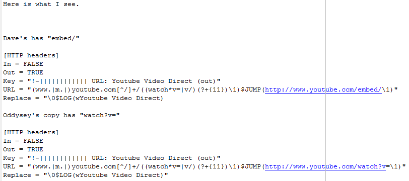 The filter in the cfg that you posted is not Dave's posted filter. Where your filter has "watch?v=" Dave's has "embed/".