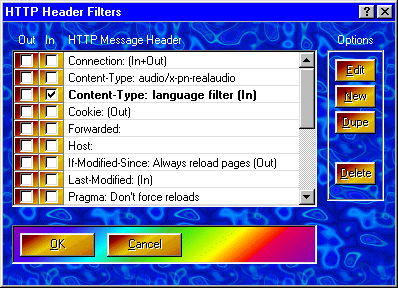 Included with the Proxomitron are filters for User-Agent, Referer, Content-Type, and Cookies plus several others. New filters are very easy to add. Here's a screenshot of the HTTP filter selection screen
