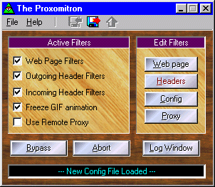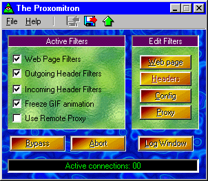 "Promiscuous" mode That's about it for the new features. Here's some more general information about the program... Proxomitron's Main Screen Here's a screenshot of the Proxomitron's main screen. Don't be put off by the bizarre color scheme - The Proxomitron uses user definable background bitmaps for its dialog boxes. You can easily change the basic look of the program - even customize the look of different filter sets you may use. The Technicolor nightmare you see here is just my own deranged selection for the defaults (hey, the program *is* free after all!)