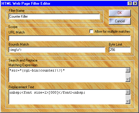 Basic Filter Set What exactly can the Proxomitron do? Well for starters, here's a list of web page filters included with the Proxomitron. Since new filters are being added all the time, the list probably isn't complete. Also remember - these are just what comes with the program. You can create similar filters of your own or alter the existing ones to better suit your taste. Allow for frame resizing: A new and rather useful rule, this will make all frames "resizeable" allowing to you finally see half-obscured frames or reclaim the screen space wasted by advertising frames. Kill Nosey JavaScripts: Kills any JavaScript that asks the wrong questions! Contains a list of "naughty" functions and properties that no JavaScript should use in polite company (including referrer, cookies, history, etc). Use it to stop JavaScripts from revealing personal information about you or your computer. Of course, you can customize the list according to what you feel is appropriate to reveal. Disable JavaScript cookies: Prevents JavaScripts from sending or receiving cookie information. Use with the URL match to allow JavaScript cookies at given sites if you wish. Hide Browser's Referrer from JS: The "referrer" is by far the most revealing data your browser sends out. By looking at referrer lists webmasters can tell not only the site you visited last, but if you clicked a link from email or a page on your hard drive, possibly more personal information as well! Note this is normally revealed in a HTTP header named "Referer" but JavaScript can be used to grab this information as well. Banner Blaster: This is the main advertising filtering rule. It takes any image that look to it like an advertisement and replaces it with a plain text link (using any original ALT text the image may have had). It's quite effective - and since ads remain clickable, seldom affects a web page's over-all function. Banner Blaster (limit text): Same as the banner blaster, but limits the amount of text to the first four words. Useful for times when advertisers attempt to cram in too much ALT text. Banner Replacer: An alternate ad killer, this rule replaces ad banners with a transparent .GIF image surrounded by a border. It keeps the layout of the page closer to the original, and is a good example of how to replace an image with one of your own. In fact, this rule can be customized to use any image you like. Area Map Ad Blaster 1 & 2: This is a two part filter designed to eliminate ads that use area maps. Area maps are different from normal banners in that they can contain several links. The first rule acts a bit like the banner blaster converting the first link it finds into text. If used alone, only the first link will be converted. The second part, when used with part 1, will continue to convert all additional links within the area map to text - retaining its full functionality. Kill Hyper Banner: Stops a particularly annoying Java based animated banner, but is really an example of how to filter out rogue Java applets. This rule can be easily expanded to filter any Java applet you choose Kill JavaScript Banners: JavaScript banners that use dynamic HTML have a unique "signature" that this rule picks up on. This rule will almost never filter anything that's not an actual ad, and although the banner blaster often works with JavaScript ads anyway, having this rule enabled gives a little extra protection. Kill All pop-up windows: Say bye bye to JavaScript pop up windows. Enabling this rule will completely disable the JavaScript "window.open" command. Restore pop-up windows after page loads: When used with the previous rule, this filter will re-enable pop-up windows once the page has finished loading. It's useful for getting rid of only those windows that pop-up when you first visit a page, while allowing windows that pop-up when you click a link or press a button to still work. It can be a good alternative to completely disabling pop-up windows. OnUnload unloader: Submitted to be by "CyberDude" this is a very useful rule. OnUnload will run a script whenever you leave a web page! An insidious tag that used for little more than opening pop-up ad windows - it makes an excellent candidate for the chopping block. Frame Jumper-Outer: One thing I've always hated is clicking on a web page's link to some other site and having it open up inside the current page's frames. Often known as "Getting Stuck in someone else's frames" it's a reflection of poor design of the original page. This rule usually takes care of this problem quite effectively. Kill alert/confirm boxes: Stops those JavaScript pop-up message boxes asking you to press OK to continue. Often used for disclaimers of one type or another. Stop status bar scrollers: Disables the JavaScript command to send text to the status bar. Eliminates scrollers and other such beasts. Kill Dynamic HTML JavaScripts: Often Dynamic HTML is used to do nothing more than push fresh ads and other annoyances your direction, this rule stops it. Be careful though, some pages may actually use dynamic HTML for something important (foolish of em' I know, but who can explain the mind of a webmaster ;-). GeoCities branding killer: Specialized rule to stop GeoCities web page branding. Also see the "Kill add-on JavaScripts" which will do this and more. Kill add-on JavaScripts: A filter I find very useful - this one gets rid of any JavaScript tacked on to the end of a web page. Usually these scripts are added by free web space providers to pop-open advertising windows or even worse "brand" a web page with their logo. Makes visiting such pages much more pleasant. Webpage Background Killer: Removes the main web page background, but leaves other background images (like those inside a table) intact. Webpage Background Replacer: Changes all web pages to use a background of your own. Change the replacement text to point to any image you like. Kill All Backgrounds (even tables): Gets rid of any background image it finds, even those 