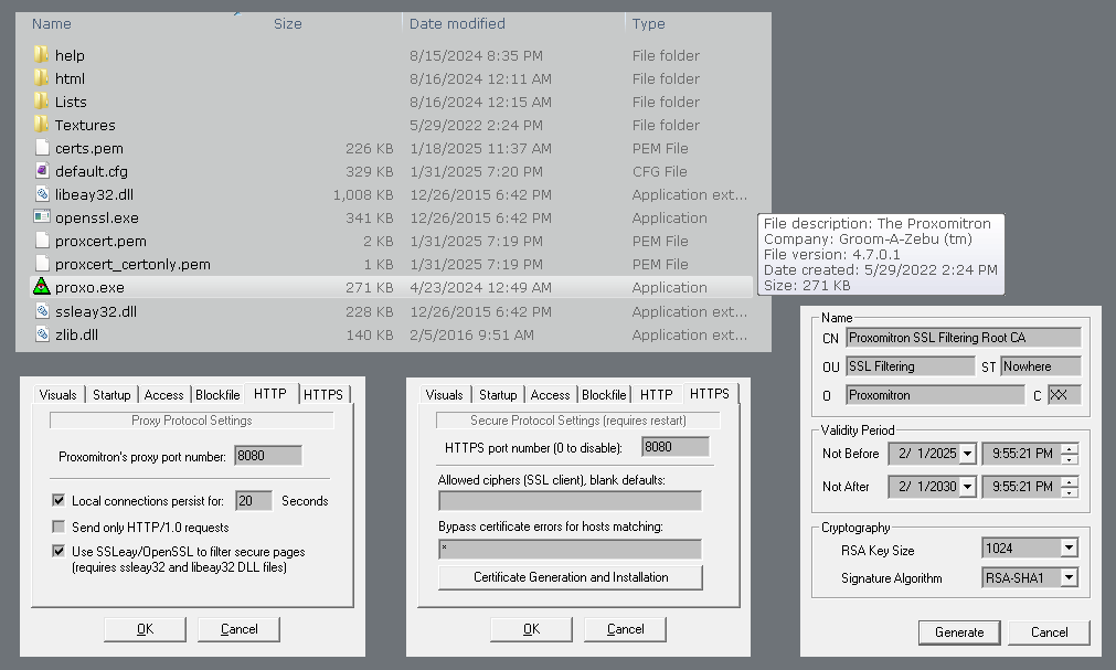 RE: Proxomitron Reborn - ProxRocks - Jun. 07, 2024 09:06 PM Yikes! If I followed correctly, this affects at least a dozen filters in SIDKI 2019-01-26b1 with uNorm. RE: Proxomitron Reborn - JJoe - Jun. 07, 2024 10:09 PM (Jun. 07, 2024 09:06 PM)ProxRocks Wrote: Yikes! I think two maybe three. <object(\s|") doesn't work in the test window. I'll check outside the window later. RE: Proxomitron Reborn - amy - Jun. 16, 2024 04:48 AM (May. 18, 2024 03:40 AM)JJoe Wrote: $RDIR and $JUMP appear to be broken but not always.$RDIR and $JUMP interact badly with HTTPS filtering because in that case there are actually two requests, the first with a CONNECT method to open the encrypted tunnel, and then the "real" request is sent inside that. This also means outbound header filters are applied twice on each request, one for the outer and another for the inner. That first one with the CONNECT has no path, which explains the bug. I suspect this was something Scott didn't realise, since he didn't see HTTPS filtering as anything but an experimental feature. Thanks for the detailed test cases. This will be fixed in the next release. The $NEST bug was actually there since the first Reborn 4.6.0.0 and it's a subtle one. I suspect the only reason Scott's code worked in that case was luck, since it turned out to be a "two wrongs make a right" type of situation. I "corrected" one of the bugs while not thinking the other was significant or related, and thus broke the $NEST parsing. Thanks for the detailed test cases. This will also be fixed in the next release. (May. 18, 2024 09:18 PM)JJoe Wrote: Some requests are using very long URLs. The Proxomitron limit appears be 2065.It is currently 4096 for the total each request (request line + headers.) Increasing it is not trivial but has been on the list of things to improve for a while. I may make it configurable since this affects the memory usage of every connection. RE: Proxomitron Reborn - dsgfh543 - Jul. 09, 2024 03:38 AM Please tell me where i can download Proxomitron Reborn 4.7.0.1 Can't find any links.. RE: Proxomitron Reborn - DullFace - Jul. 10, 2024 06:43 AM It's on the first page. RE: Proxomitron Reborn - dsgfh543 - Jul. 10, 2024 07:19 AM --- Attached File(s) ProxomitronReborn_4600R.zip (Size: 144.19 KB / Downloads: 1474) ProxomitronReborn_4700R.zip (Size: 968.49 KB / Downloads: 164) ProxomitronReborn_4517R.zip (Size: 139.66 KB / Downloads: 862) ProxomitronReborn_4701R.zip (Size: 972.37 KB / Downloads: 141) ProxomitronReborn_4520R.zip (Size: 139.77 KB / Downloads: 901) ProxomitronReborn_4601R.zip (Size: 144.4 KB / Downloads: 749) ProxomitronReborn_4602R.zip (Size: 144.32 KB / Downloads: 795) ProxomitronReborn_4603R.zip (Size: 144.48 KB / Downloads: 1002) ProxomitronReborn_4604R.zip (Size: 144.7 KB / Downloads: 1097) ProxomitronReborn_4605R.zip (Size: 145.47 KB / Downloads: 1959) --- That is all. Don't see link on 4.7.0.1 RE: Proxomitron Reborn - DullFace - Jul. 10, 2024 09:40 AM It's the least downloaded. RE: Proxomitron Reborn - dsgfh543 - Jul. 10, 2024 09:51 AM Thanks a lot. RE: Proxomitron Reborn - rasczak - Jul. 23, 2024 03:40 AM Noticed a problem loading this site: www. fs.usda.gov - Using reborn 4701 with new 3.0 openssl dlls ---- It looked like it would start to load normally, then it would ping-pong tcp 'keep alive' and 'window update' packets back and forth until my machine sent a tcp reset and then the site would stop responding with no resources transmitted to my browser (site doesn't load at all) and proxo keeps the connection open. (Abort button hangs proxo and requires killing the process.) - Using reborn 4701 with old 1.0 openssl dlls ---- It looked like it would start to load normally, then it would ping-pong tcp 'keep alive' and 'window update' packets back and forth for a bit, then load the site. Then go back to ping-pong for a bit, then stop. Proxo wouldn't close the connection. - Bypassing reborn 4701 loads the site normally. - Old proxomitron and 1.0 openssl dlls loads the site normally.. RE: Proxomitron Reborn - amy - Jul. 28, 2024 05:33 AM (Jul. 23, 2024 03:40 AM)rasczak Wrote: Noticed a problem loading this site: www. fs.usda.govThat looks like a site which appears to discriminate based on user-agent header. If I don't send any UA header it hangs too, and if I send some non-standard or old UA, it also hangs. However, I can confirm that this one works: Code: User-Agent: Mozilla/5.0 (Windows NT 5.1; rv:45.0) Gecko/20100101 Firefox/80.0A useful tip for troubleshooting is to bypass outgoing header filters, which lets Proxomitron still handle the TLS negotiation with the site and filter incoming content, but otherwise outgoing headers from the browser remain unfiltered. You can also bypass incoming and page filters if you suspect those are the cause. If bypassing all filtering doesn't work but "full" bypass (i.e. Bypass button) does, then it's probably some form of TLS fingerprinting (which I'm still working on a solution to); if a site works with outgoing header filtering bypassed, then it's probably some filter you have which is altering outgoing headers in a way that the remote server doesn't like. RE: Proxomitron Reborn - zoltan - Feb. 02, 2025 03:29 AM I've just upgraded to Firefox 115esr for reasons explained in another thread and Reborn is giving me nothing but security cert errors and won't load any site. I've gotten a version of ProxHTTPSProxy (REV3e) to work, so I'm guessing there's something in my files or config that isn't right. I like the concept of Reborn better so I'd like to get it working, hopefully without any SSL errors. Here's a view of the relevant folders and some config screencaps. RE: Proxomitron Reborn - amy - Feb. 02, 2025 03:37 AM What exact cert errors are you getting? That should tell you more precisely what's wrong. RE: Proxomitron Reborn - JJoe - Feb. 02, 2025 04:41 AM Also, try: Setting the HTTPS port to 8443. You have 8080. Add the "309" files from https://prxbx.com/forums/showthread.php?tid=2179&pid=18693#p