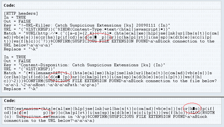 Place this filter after the URL-Parser, rename it if needed Code: [HTTP headers]And the suspicious filters can be now resumed to only one filter Code: [HTTP headers] |